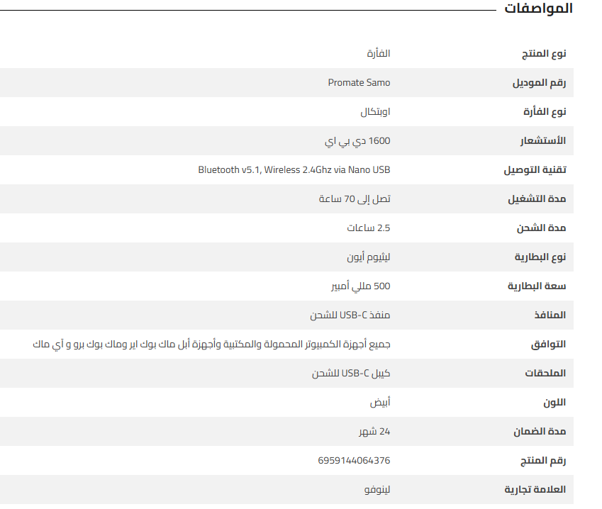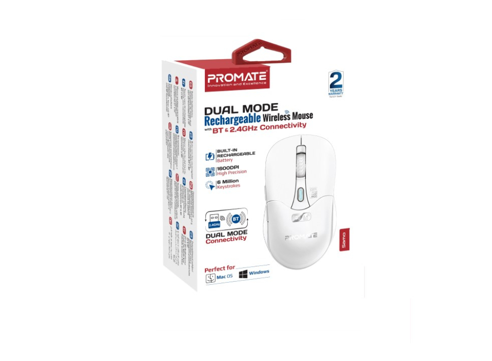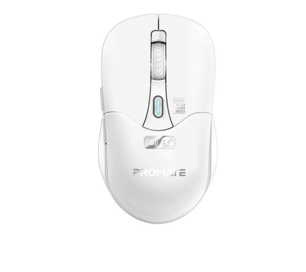 بروميت Samo ماوس لاسلكية قابل لإعادة الشحن، توصيل ثنائي بلوتوث + جهاز استقبال نانو USB-A، عدد 6 أزرار وظيفية، 3 مستويات لدقة قابلة للتعديل حتى DPI 1600، وقت عمل يصل إلى 70 ساعة، منفذ USB-C للشحن - أبيض