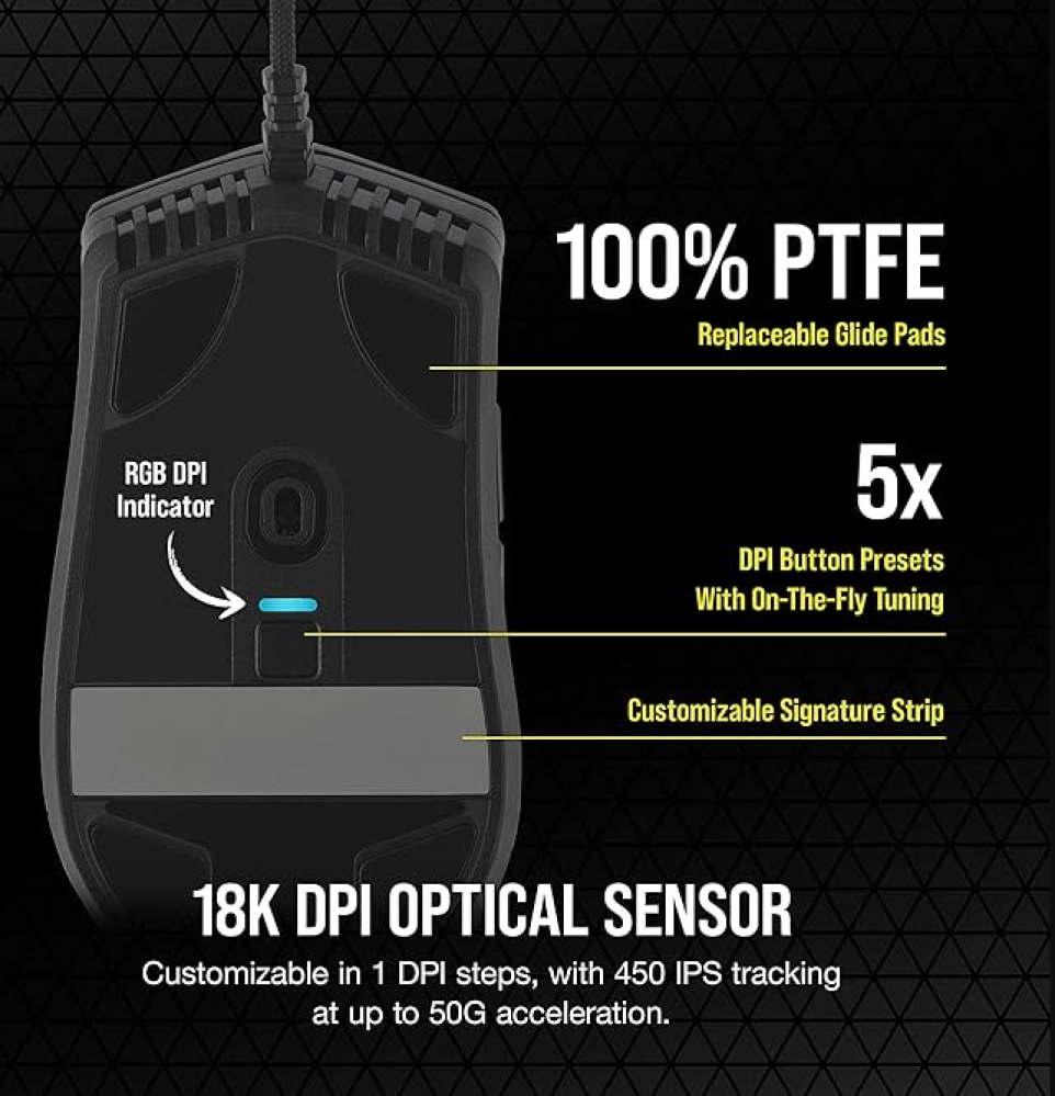 - مدعوم بتقنية المعالجة الفائقة من كورسير اكسون: ينقل حركاتك ونقراتك إلى جهاز الكمبيوتر الخاص بك بسرعة تصل إلى 8 مرات من ماوس الألعاب التقليدية مع تقنية التصويب الفائق 8000 هرتز.